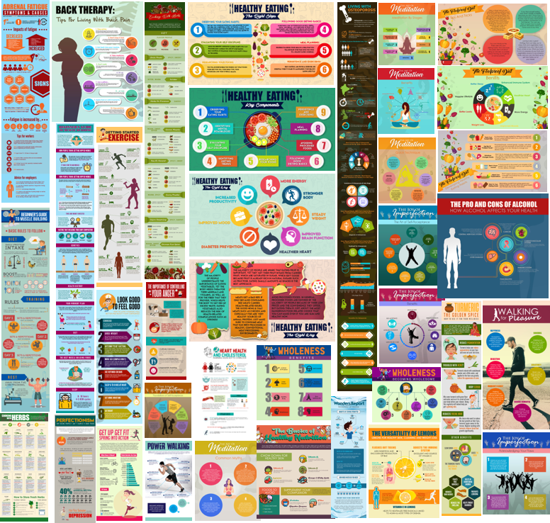 Within this collection, you're going to get 37 done-for you (and editable) infographics with a health theme that can be used in your own social media, on your website or blog, or any way you can think of for your projects.