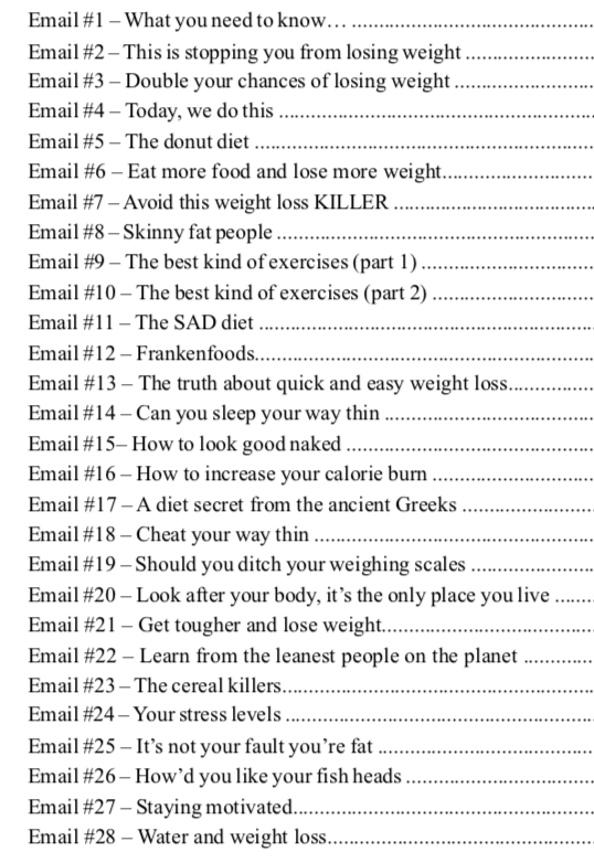 Here's are four solid weeks of daily emails which are perfect for your weight loss coaching program (or products). Customize them for your needs then load them into your email responder and start seeing sales in your paypal account by tonight.